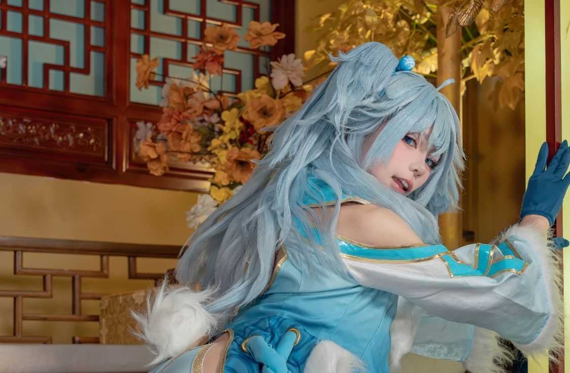 从这些照片来看,兔娘ovo的芙洛伦不仅仅是把服装穿了个遍,更像是将角色的灵魂融入了自己的身上。那件带有光泽感的蓝色和银色结合的衣服,搭配白色的毛绒元素,简直是如梦似幻,令人无法移开眼睛。而她灵动的眼睛,配合那些精致的妆容和假发,完美捕捉了芙洛伦作为一位温柔且坚韧的角色所应具备的气质。